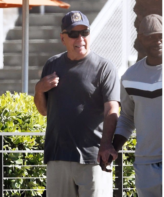A sus 70 años, Bruce Willis —el rostro invencible del cine de acción durante décadas— fue fotografiado esta semana caminando lentamente por la orilla del mar, con la mano suavemente entrelazada con la de su asistente. Las imágenes, a la vez tiernas y desgarradoras, muestran al actor observando el entorno con una expresión vulnerable, casi infantil en su curiosidad. Para muchos fans, verlo avanzar con tanta cautela fue un recordatorio doloroso del rápido deterioro causado por su demencia frontotemporal, una enfermedad cuyo avance su familia ha compartido con creciente franqueza… y creciente dificultad.