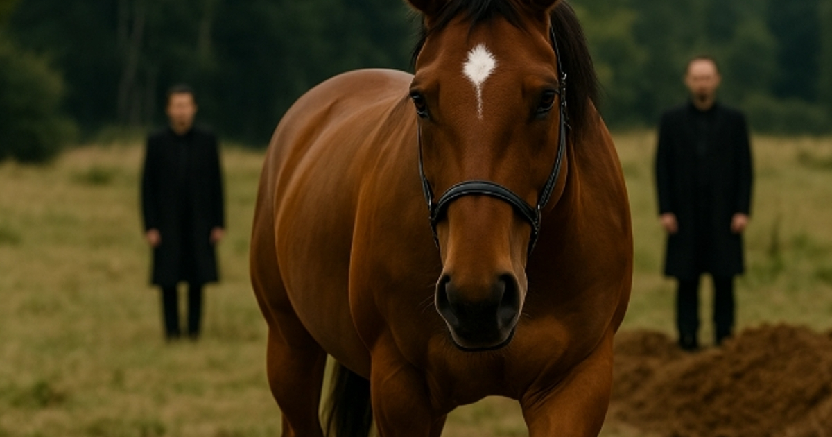 El caballo inclinó lentamente la cabeza, rozó la tapa del ataúd con el hocico y emitió un sonido —suave, lastimero, como un llamado.