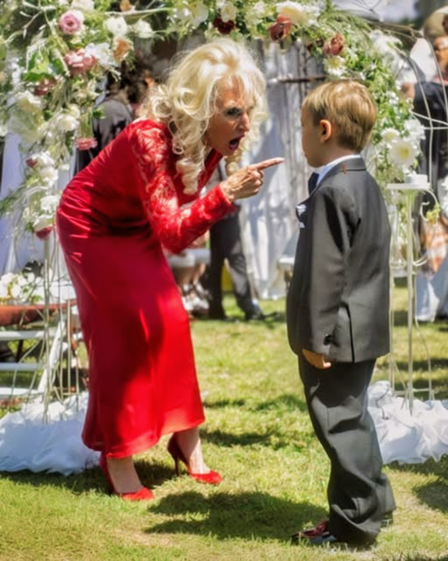 Entonces, la hostilidad de Linda se manifestó de la peor manera. En las fotos, se colocaba deliberadamente para tapar a Josh y llegó a decir en voz alta que “no formaba parte de la familia”. Olivia intentó intervenir con calma, pero Linda fue más allá: empujó a Josh durante una foto formal y lo llamó “parásito”, afirmando que no pertenecía allí. El horror recorrió a los invitados mientras Olivia abrazaba a su hijo, temblando de rabia y conmoción.