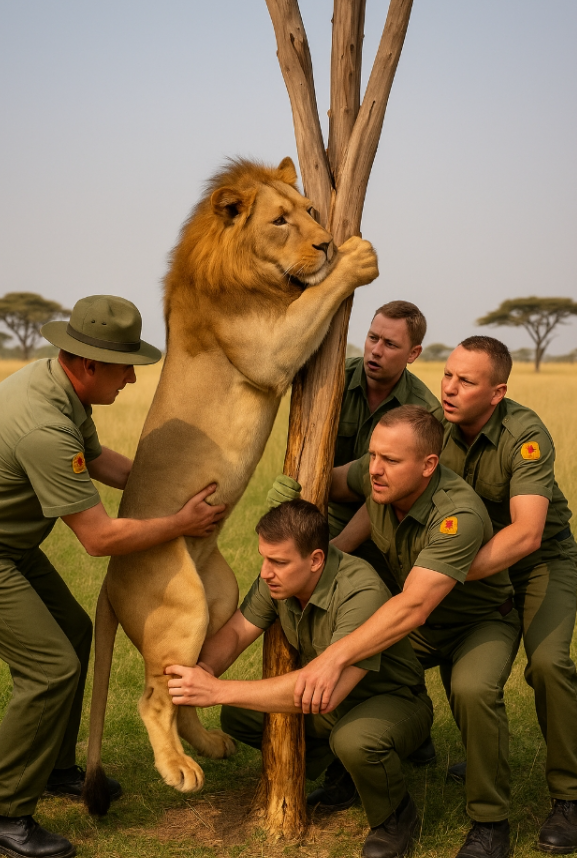 Il leone. Il grande, fiero predatore — giaceva sotto un albero, quasi immobile. La criniera arruffata, gli occhi socchiusi, il respiro appena percettibile. Avvicinandosi, i ranger si bloccarono: un grosso ramo gli stringeva il collo come un cappio. La pelle era lacerata, il sangue secco. Si capiva che aveva lottato. A lungo. E stava perdendo.